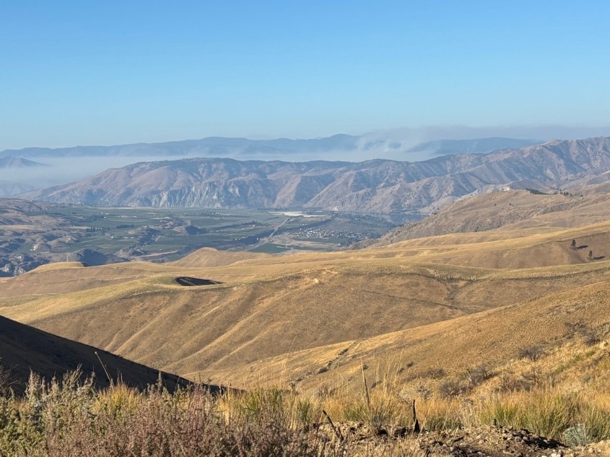 After the heavy easterly winds cleared out the Lake Chelan Valley yesterday, I took advantage of the clear air and did a quick downhill on the Butte. At the summit, you could see the changing winds blowing Sugarloaf fire smoke towards the Columbia (above) and engulfing Wenatchee (below).