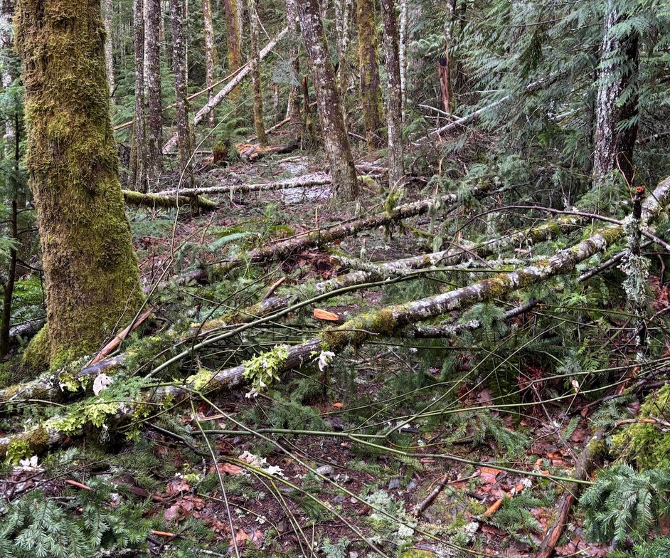 Since Stevens Pass and Mount Baker were expecting two feet of snow over the next couple of days, I went to North Mountain one more time to get as high as I could. I parked at the bottom of Skyline and began my climb. Snow on the ground began just above Pathfinder (the report image was a blockage on Pathfinder). Snow covered truck tracks helped me get the bike up to the access road to the Jackpot midpoint. The access road was a foot deep of snow and all hike a bike. Not worth doing it anymore until Spring! Once I reached Jackpot,it got worse! As I started my descent in the snow and wind debris, I came across probably three dozen downed trees, to climb over or around, before I joined up with Skyline again. It wasn’t a fun descent and some blockages were piles of trees! When the chainsaws come to clean all of this up, they will feel like they’re blazing new trail since the blockages are so extensive.
