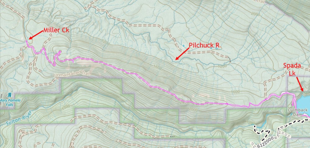 {This report has nothing to do with Blue Mt per se but you can't file a report without some preselected route]. A few months ago I rode the P-5000 road from its start at Menzel Lk Rd to an FS rd that went up Mt. Worthy. Ditched the bike at one point and hiked to the top for good views of Mt. Pilchuck and surrounding area. The road beyond where I turned off looked well used, probably from logging traffic. I was curious if you could get all the way to Spada Lk. I started on that end, from the Culmback Dam Rd., rode across the dam to the N. shore of Spada and took a trail W. at the first 90º turn to the N. The trail's an old road that in <2 mi. connects to a still maintained FS rd. (unnumbered) that I rode several miles to a low point where another overgrown, decommissioned road led to Miller Ck.I brushbashed ~¼ mi. to the creek where I could see a road berm on the other side but no sign of a bridge--evidently completely removed or else in summer they just drove across it. The FS rd I took followed a ridge dividing the Sultan R. watershed from the Pilchuck R.drainage. This route never crosses the Pilchuck so would never link up with the P-5000 road, but does go to Lk Chaplain so you could theoretically access it from there. The P-5000 road stays on the N. side of Pilchuck R. and might be bikeable from Culmback Dam by staying on the N. side road ~2000' farther where at another 90º turn a different trail links up to it (on the map). The Pilchuck valley is fairly gentle and scenic and with no motorized vehicles except if they are logging somewhere. It's not bad riding and includes some actual trail. I cleared the trail section I rode and its now quite rideable although there is some blowdown at the FS rd end and one med tree to hoist bike over about midway. Someone with a saw could clear these obstacles fairly quickly.